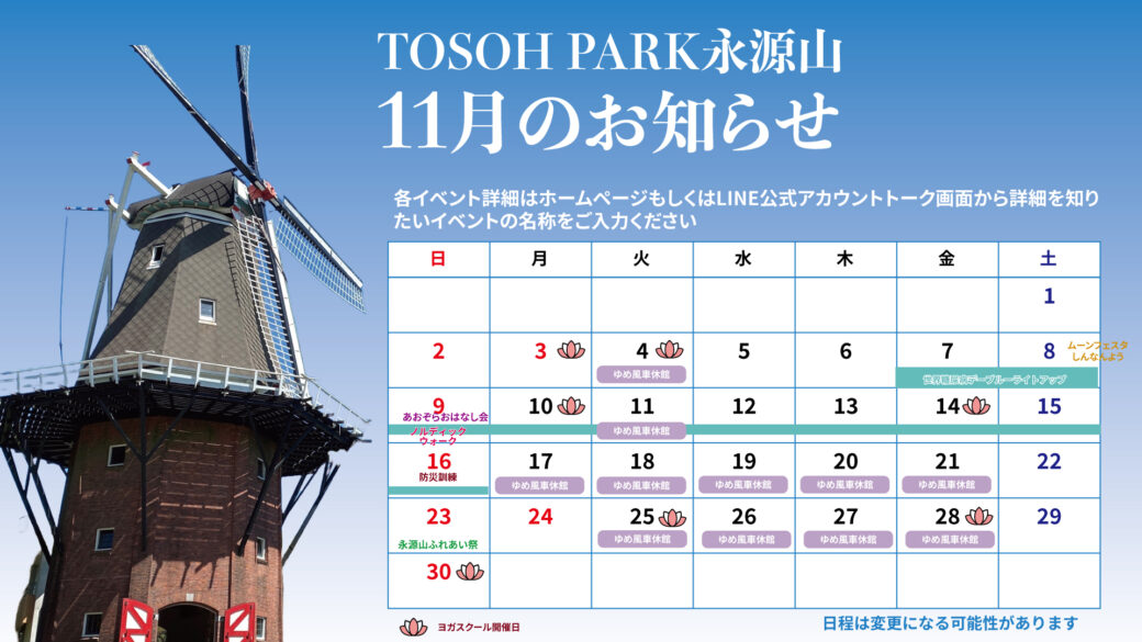 11月のゆめ風車展示室休館他スケジュールは以下の通りです